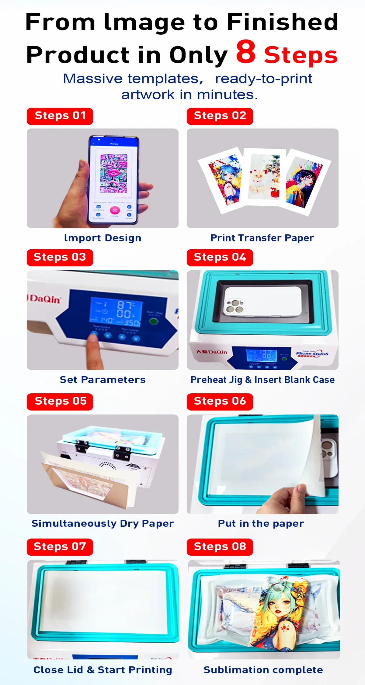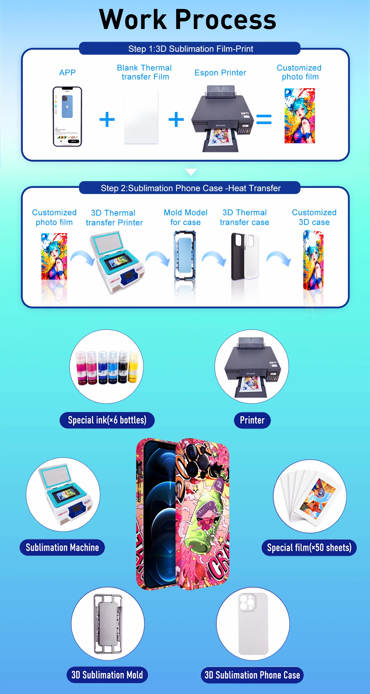 - The phone case printer process can use sublimation ink to print any picture in the album on the 3D sublimation film